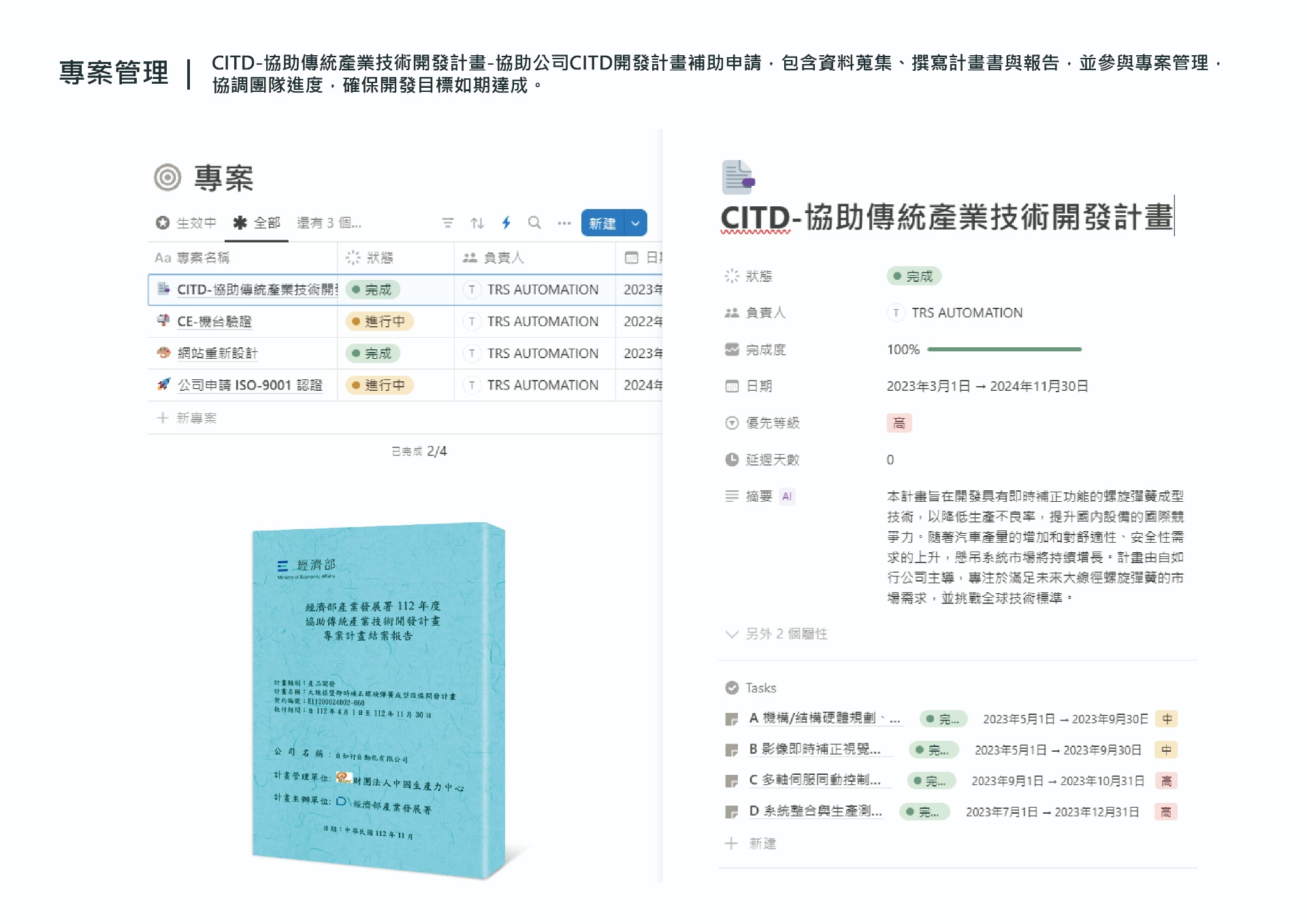 與技術部門密切合作,統整產品、開發進度與產業價值資料,整理成委員易於閱讀的視覺化報告內容。負責報告排版與圖表設計,並協助專案負責人追蹤各階段進度,確保申請流程與成果驗證順利完成。