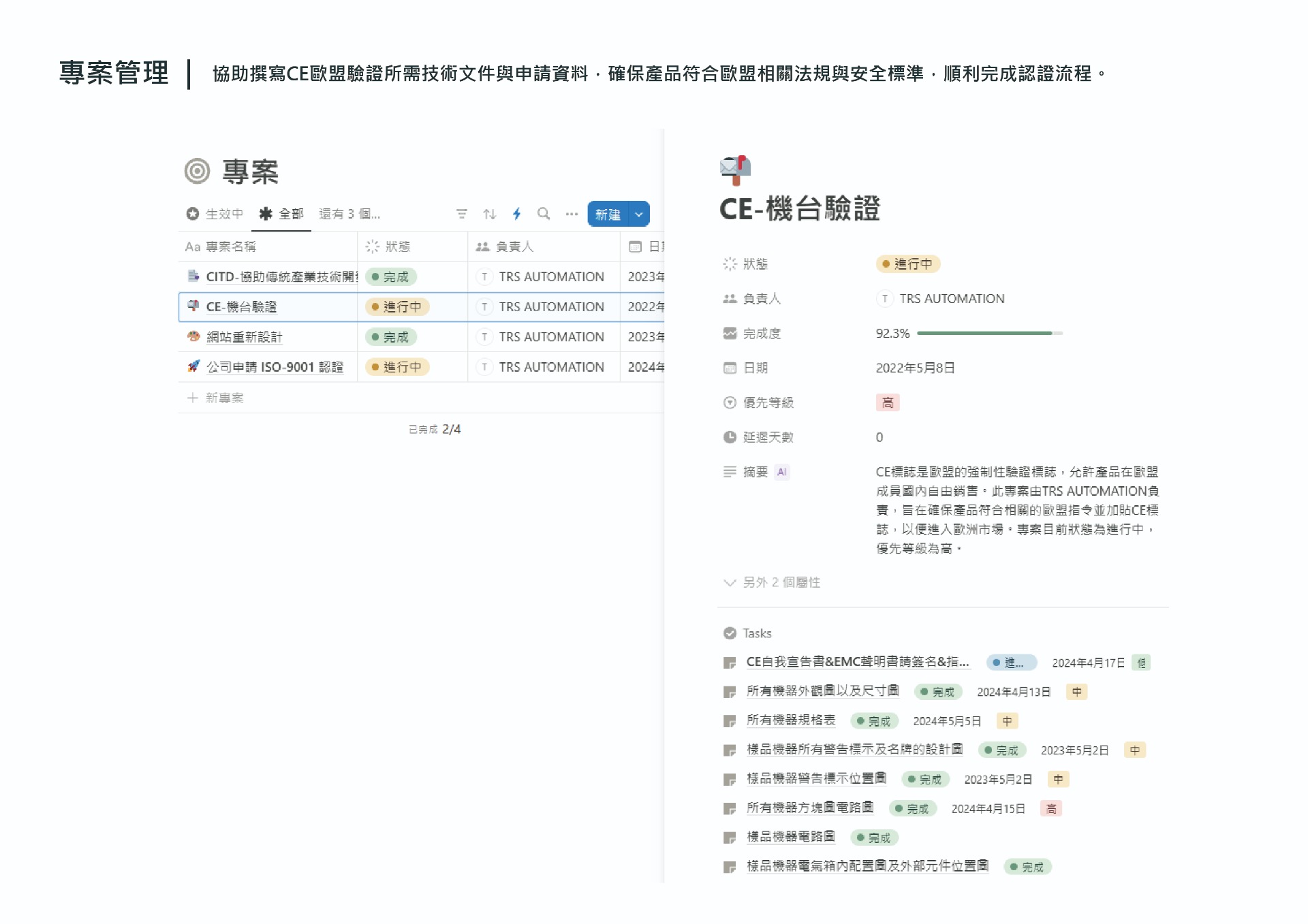 協調研發、生產與品保等部門,彙整所需技術文件與風險評估資料,並設計製作符合歐盟規範的操作手冊與安全文件。以實務導向的圖文並陳方式,協助通過驗證並提升文件專業度。
