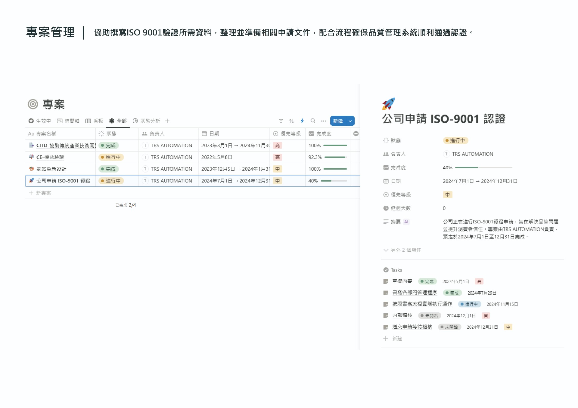 建立專案表單與進度追蹤系統,確保各項任務與關鍵時間點能準時交付。針對不同部門需求,彙整目前進度、待補資料與預期目標,作為內部專案回報與調度的參考依據。